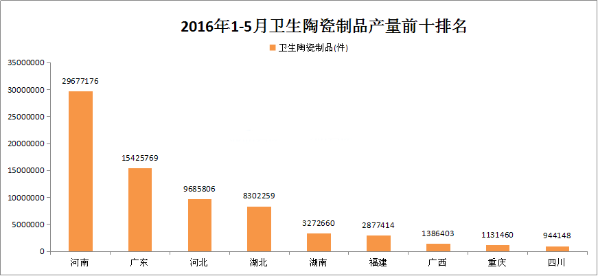 2016年1-5月全國(guó)衛(wèi)生陶瓷制品產(chǎn)量排名TOP10