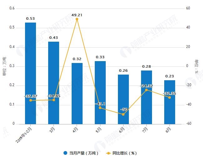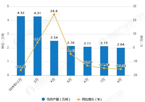 據(jù)國家統(tǒng)計(jì)局統(tǒng)計(jì)數(shù)據(jù)顯示,2019年1-2季度湖南省化學(xué)農(nóng)藥原藥產(chǎn)量波動(dòng)幅度不大,2019年7月湖南省化學(xué)農(nóng)藥原藥產(chǎn)量為0.28萬噸,同比下降24.32%。2019年1-8月湖南省化學(xué)農(nóng)藥原藥產(chǎn)量為2.49萬噸,...