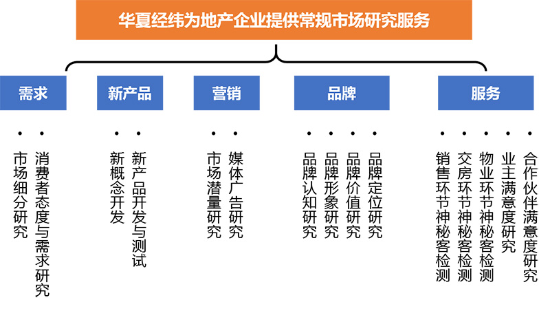 針對地產(chǎn)企業(yè)的不同業(yè)務部門/模塊,華夏經(jīng)緯提供多樣化、全覆蓋的市場研究服務,全面助力專項業(yè)務能力提升。