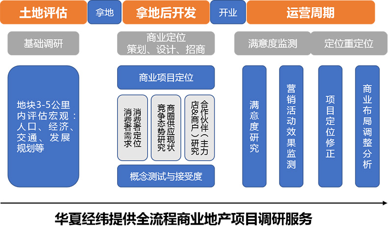 針對項目開發(fā)的不同工作階段,華夏經(jīng)緯提供覆蓋全開發(fā)流程的市場研究作為智力支持。