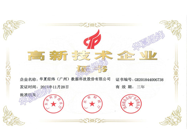 2018年12月16日,華夏經(jīng)緯(廣州)數(shù)據(jù)科技股份有限公司通過了由廣東省科技廳、廣東省財政廳、國家稅務(wù)總局廣東省稅務(wù)局組織的國家高新技術(shù)企業(yè)認(rèn)定,并榮獲國家“高新技術(shù)企業(yè)”稱號,由此正式邁入國家高新技術(shù)企業(yè)行列。