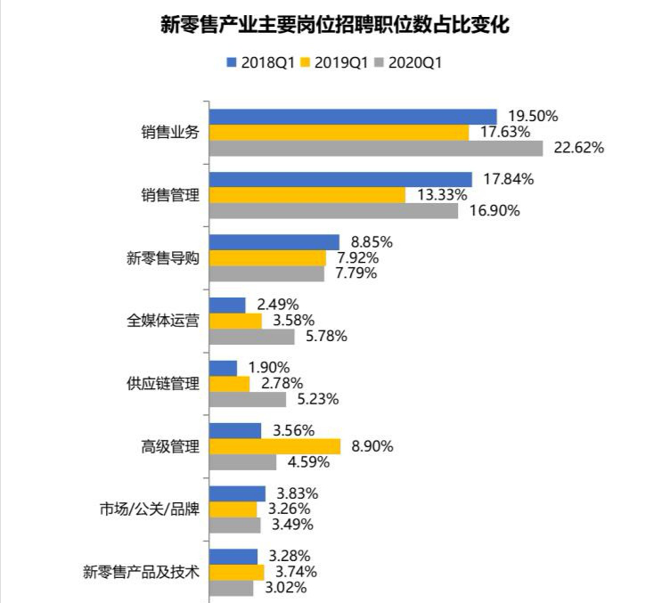 ToB的銷售和ToC的導購是新零售的主體崗位,2020年一季度,銷售業(yè)務(wù)、銷售管理和新零售導購崗位的招聘職位數(shù)分別占新零售總體的22.62%、16.90%、7.79%。全媒體運營、供應(yīng)鏈管理等新零售中臺崗位招聘需求保持增長態(tài)勢,2020年一季度招聘職位數(shù)占比較2018年一季度均提高超過3個百分點。