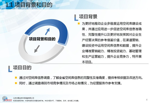 為更好地推動企業(yè)多緯度運(yùn)用空間庫建設(shè)成果,并通過應(yīng)用進(jìn)一步促進(jìn)空間庫信息準(zhǔn)確性、完整性提升以及更好地發(fā)揮其對企業(yè)生產(chǎn)經(jīng)營決策的參考借鑒價值,在渠道營銷、建設(shè)投資中運(yùn)用空間庫信息和數(shù)據(jù),提升企業(yè)精準(zhǔn)營銷能力、精準(zhǔn)投資能力、基礎(chǔ)管理和生產(chǎn)運(yùn)營能力,提升企業(yè)競爭力。中國電信股份有限公司湖南分公司委托北京華夏經(jīng)緯市場調(diào)查有限公司完成湖南省空間庫信息調(diào)查項目。近日項目通過階段驗收。