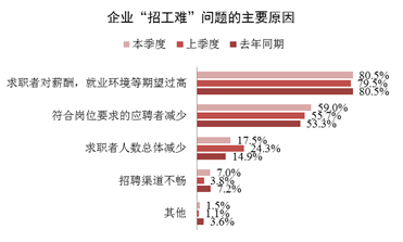 從招工難的原因看,一是求職者對薪酬、就業(yè)環(huán)境期望過高,占80.5%,環(huán)比增加了1.0個百分點。二是符合崗位要求的應(yīng)聘者減少,即人崗不適應(yīng)的,占59.0%,三是求職者人數(shù)總體減少,占17.5%。從三個季度的監(jiān)測情況看,人崗不適應(yīng)的情況略有增多。(此項為多選,各項占比相加不等于100%)
