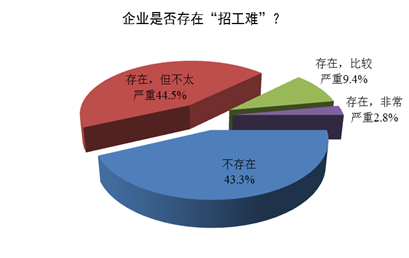 調(diào)查顯示,一季度的353家企業(yè)中有200家企業(yè)認(rèn)為目前存在“招工難”問題,占比達56.7%,環(huán)比上升4.3個百分點,其中認(rèn)為目前存在“招工難”問題但不太嚴(yán)重的有157家,占44.5 %,認(rèn)為比較嚴(yán)重的有33家,占9.4%,非常嚴(yán)重的有10家,占2.8 %。